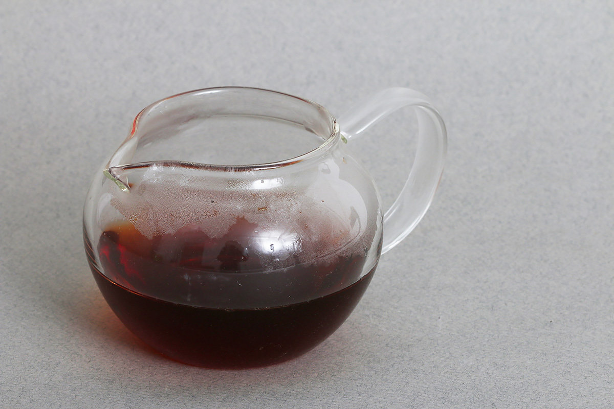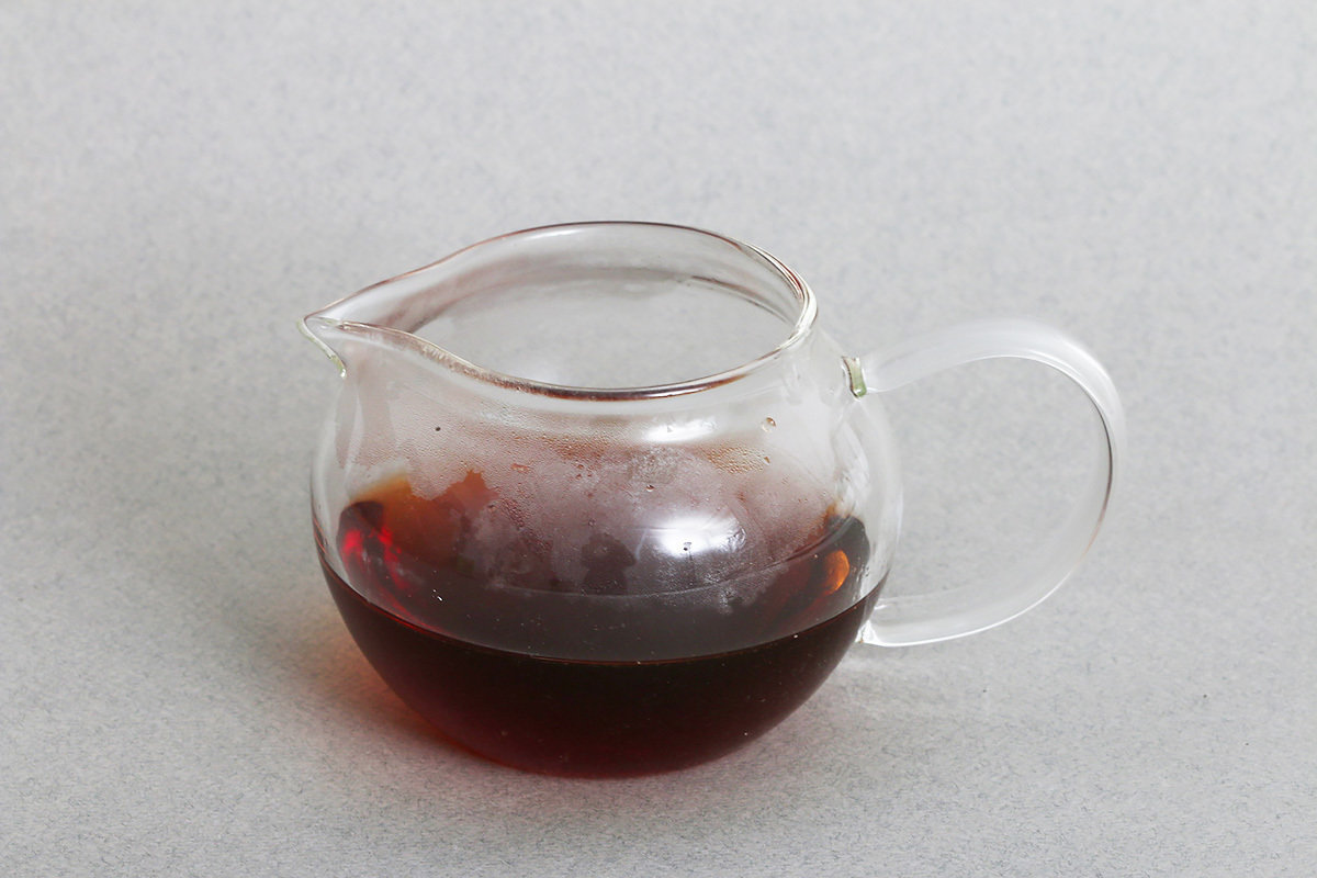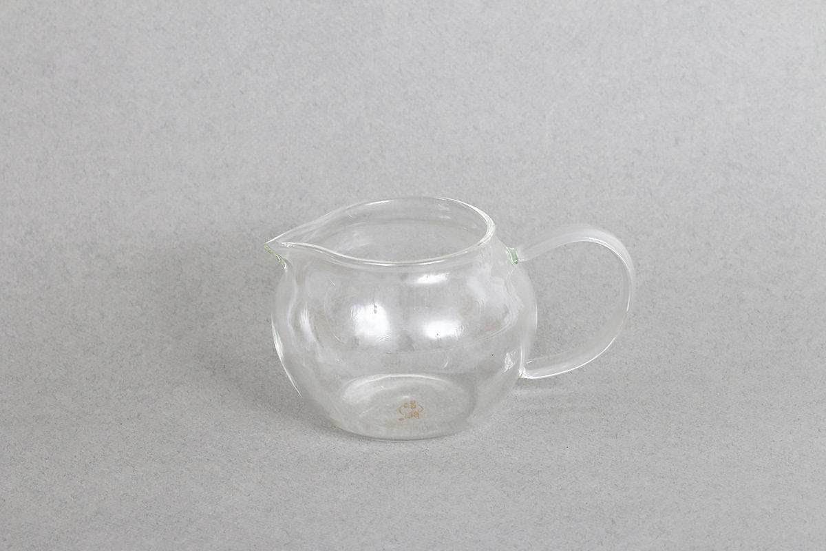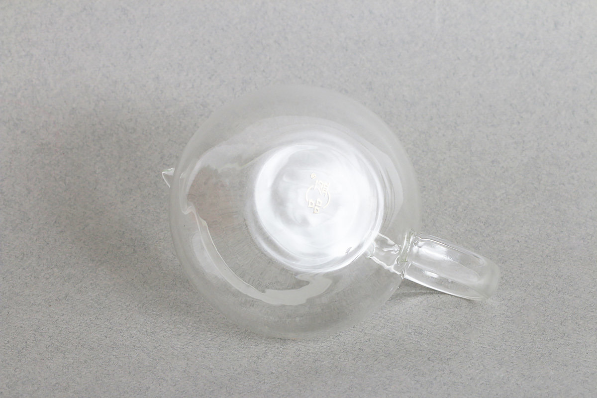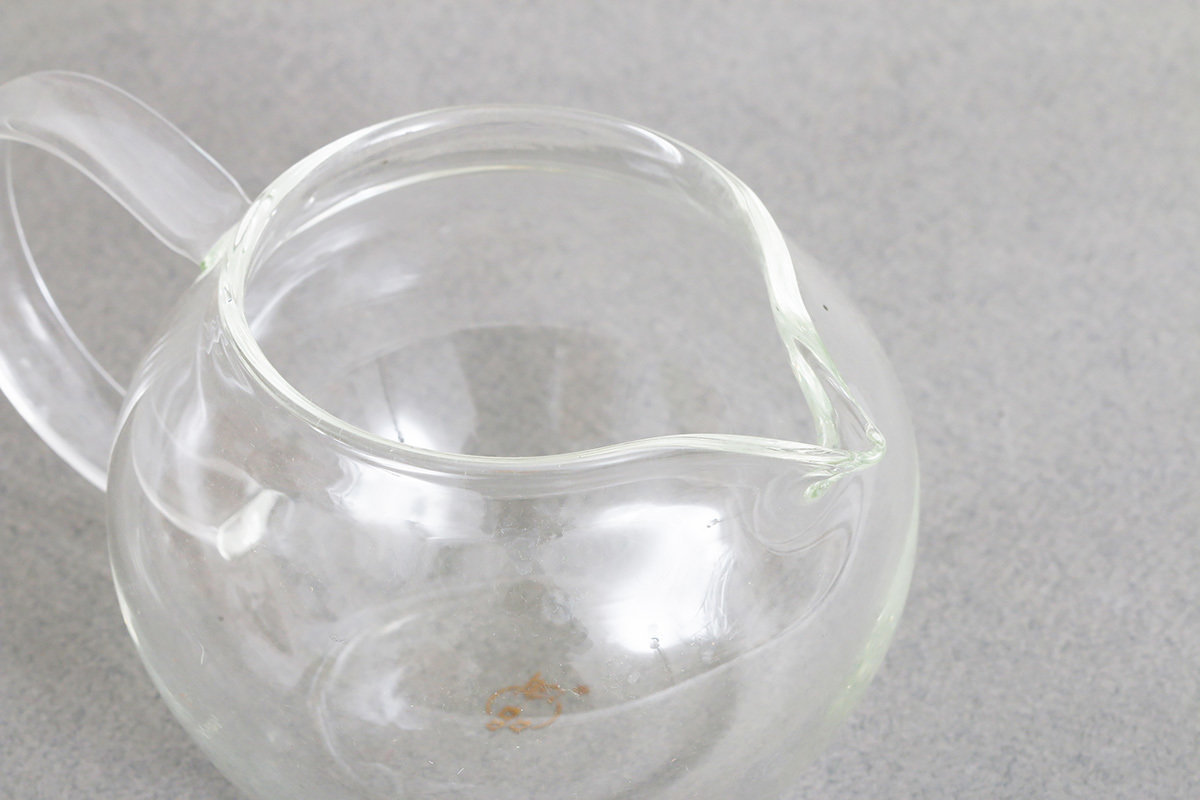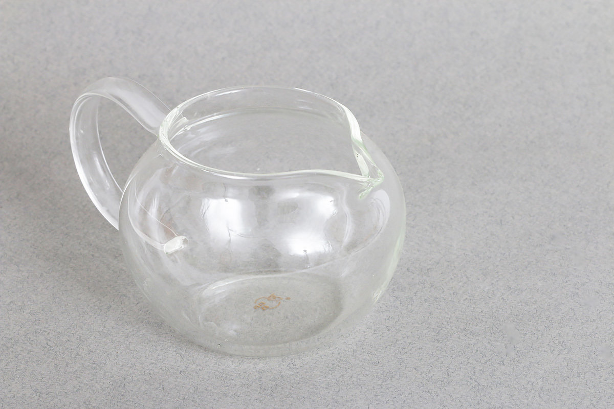 Круглый стеклянный чахай от фабрики Ши Као. В стеклянном чахае виден цвет чайного настоя.