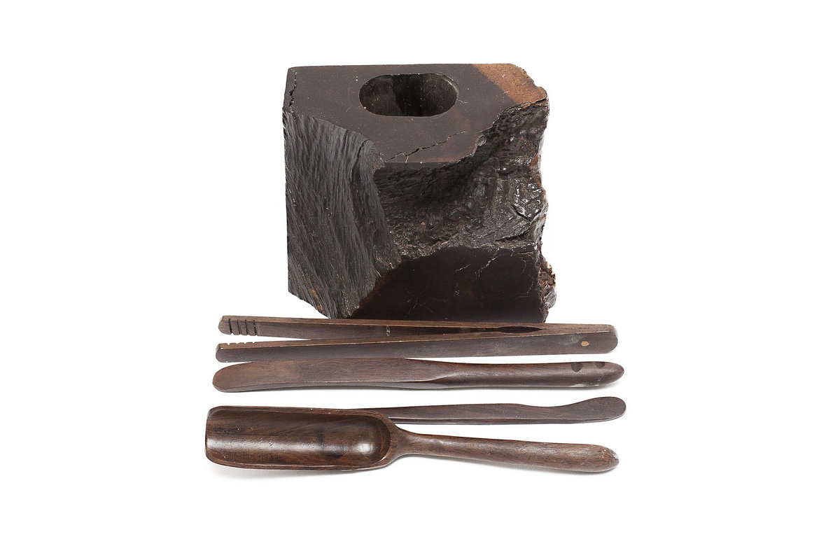 Роскошный набор чайных инструментов в подставке из цельного спила дерева. В комплекте: лопатка для чая, совочек для чая, игла для чайника. Дефект: отсутствуют щипцы. К набору легко можно подобрать другие.